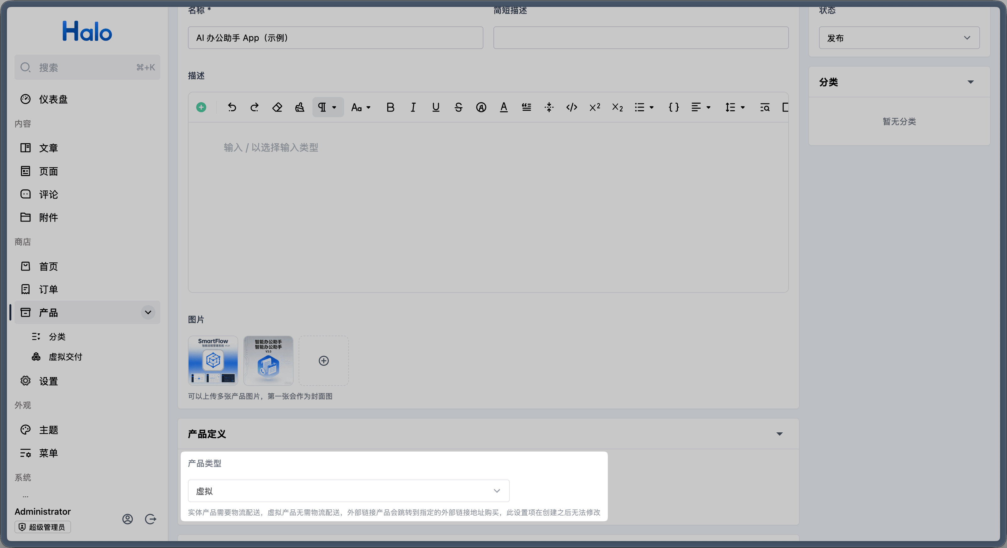 完整的创建产品流程可参考 产品管理 文档,需要注意的是,如果产品要支持虚拟交付,需要在产品类型中选择 虚拟 产品类型。