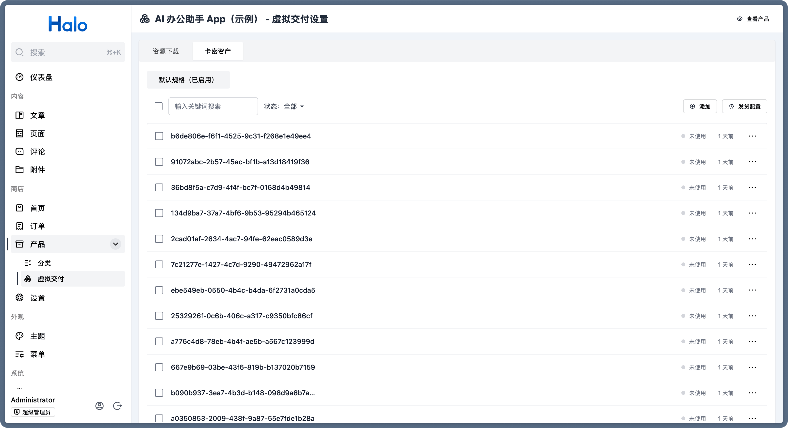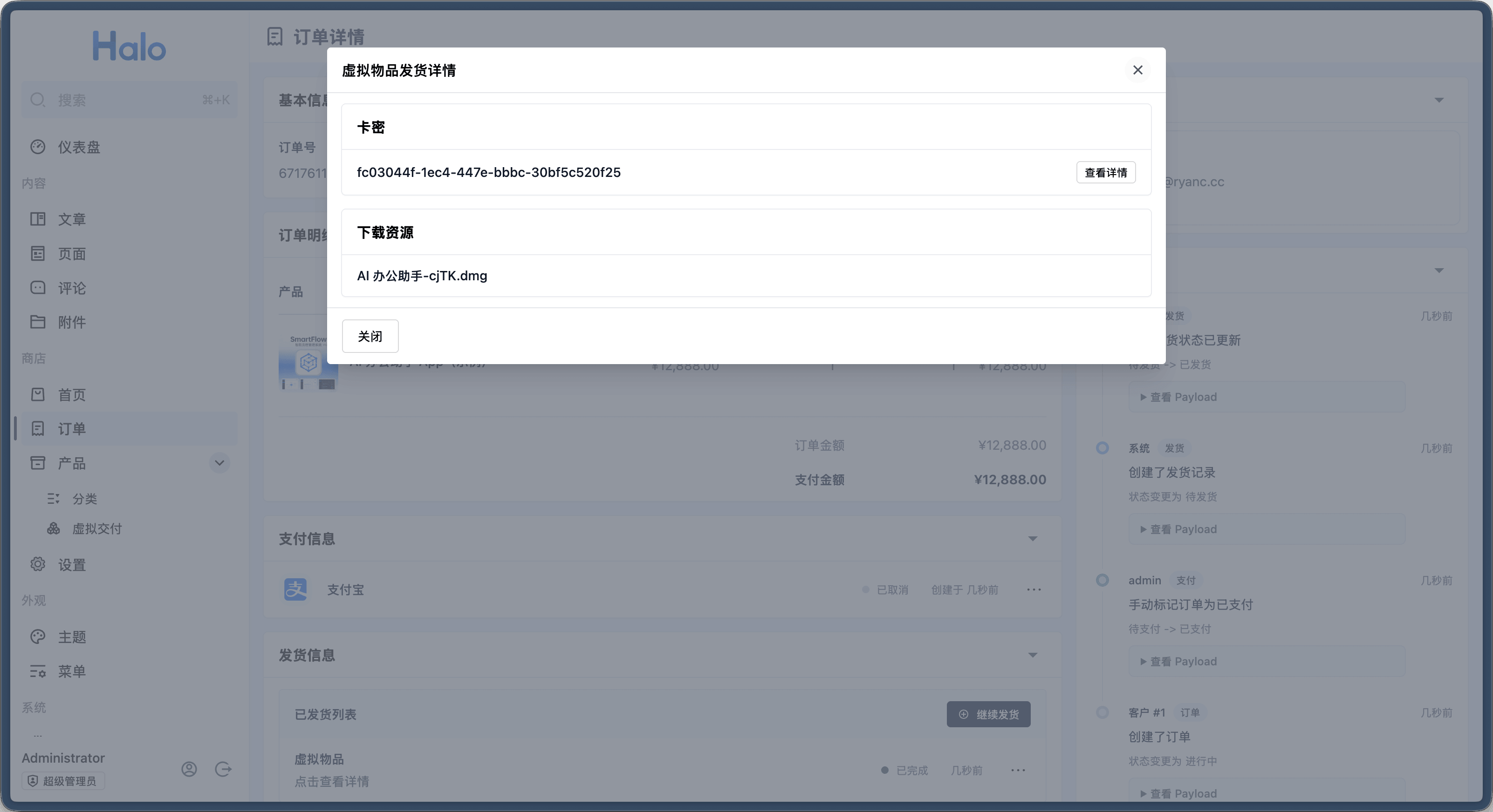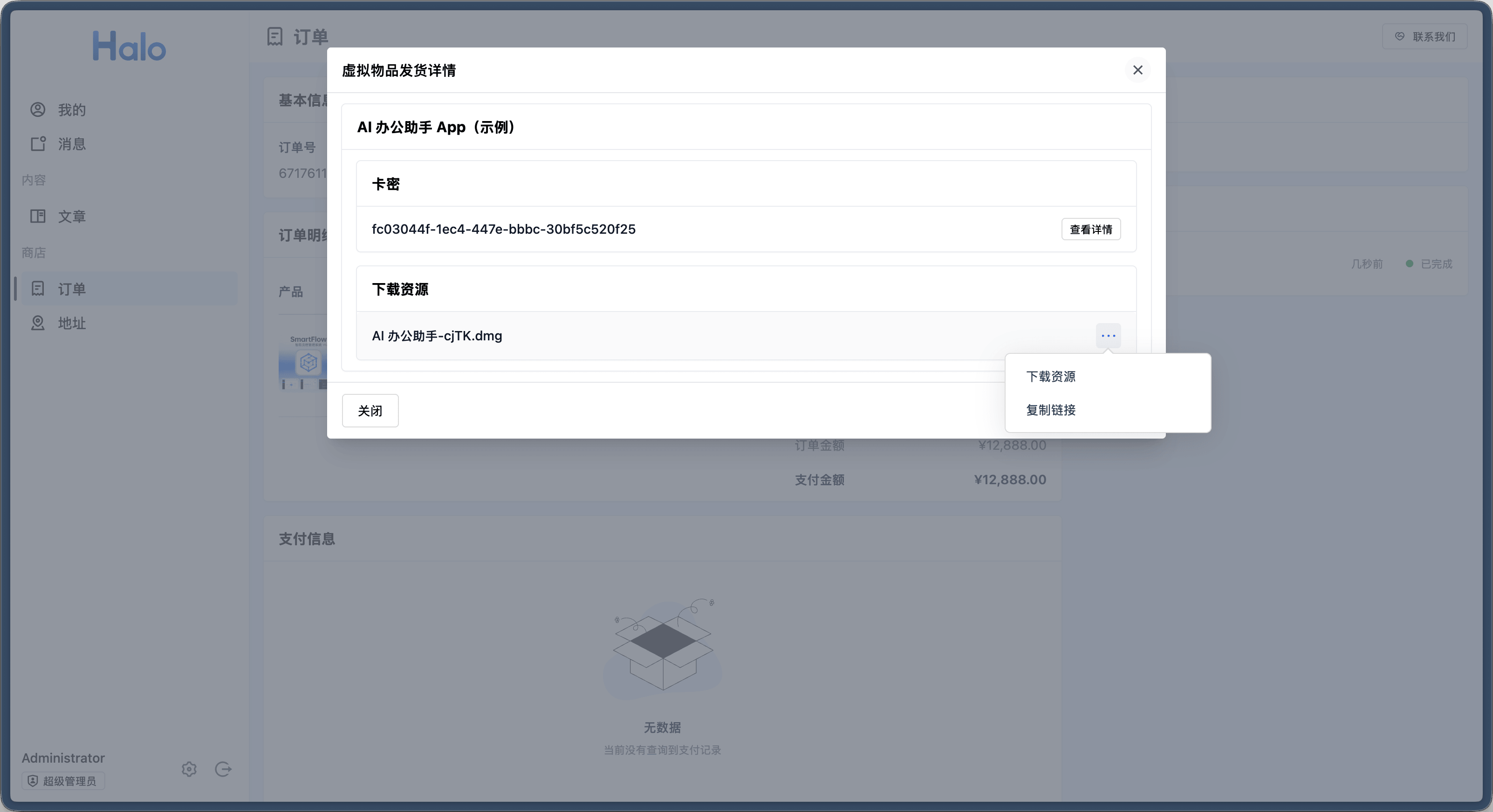 在 Halo 2.23 中,我们完善了虚拟产品的发货功能,目前支持文件资源下载、卡密发货。