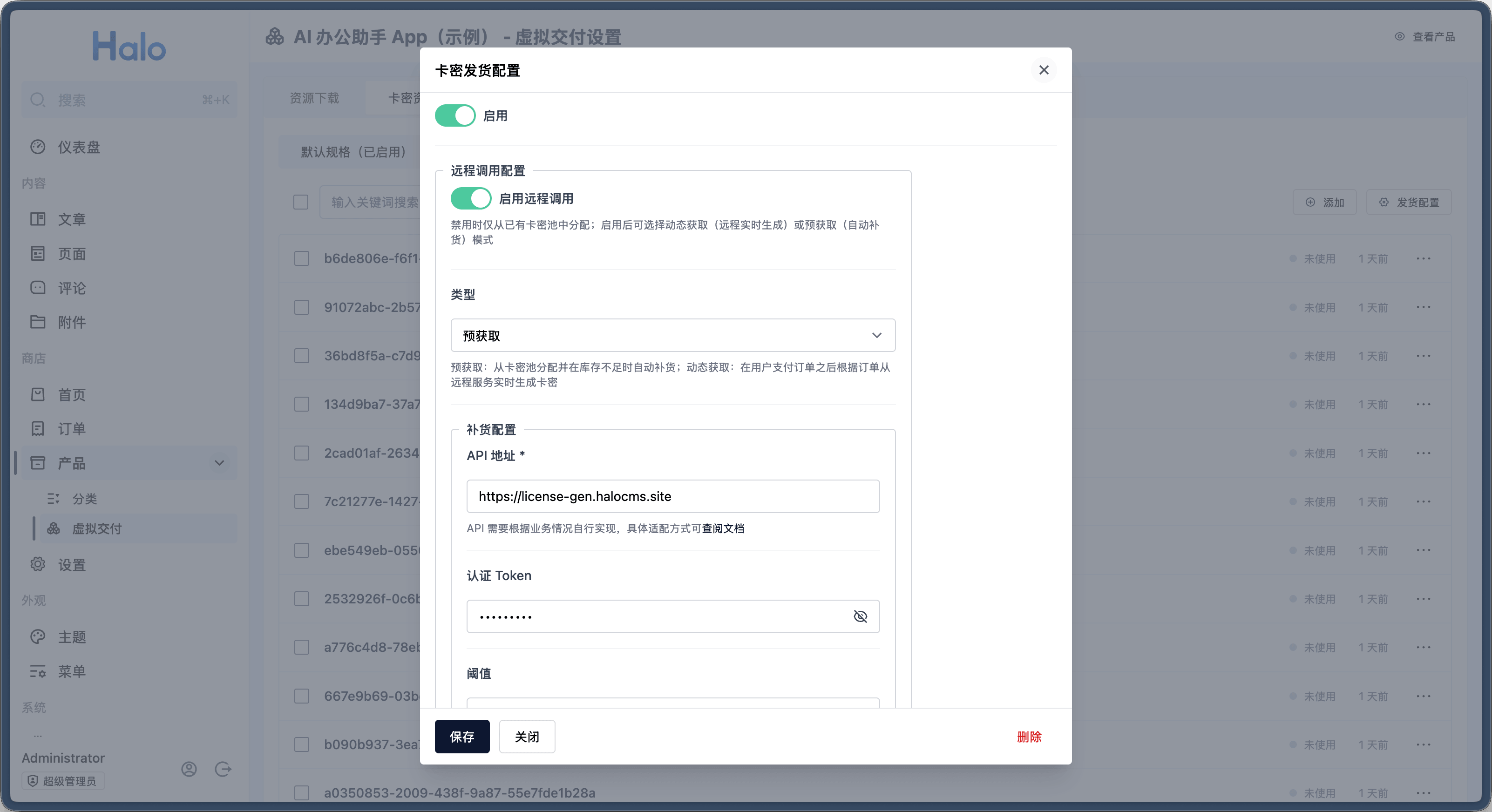 用户下单后,Halo 会向配置的远程地址发起请求,由你的服务实时生成或分配卡密。