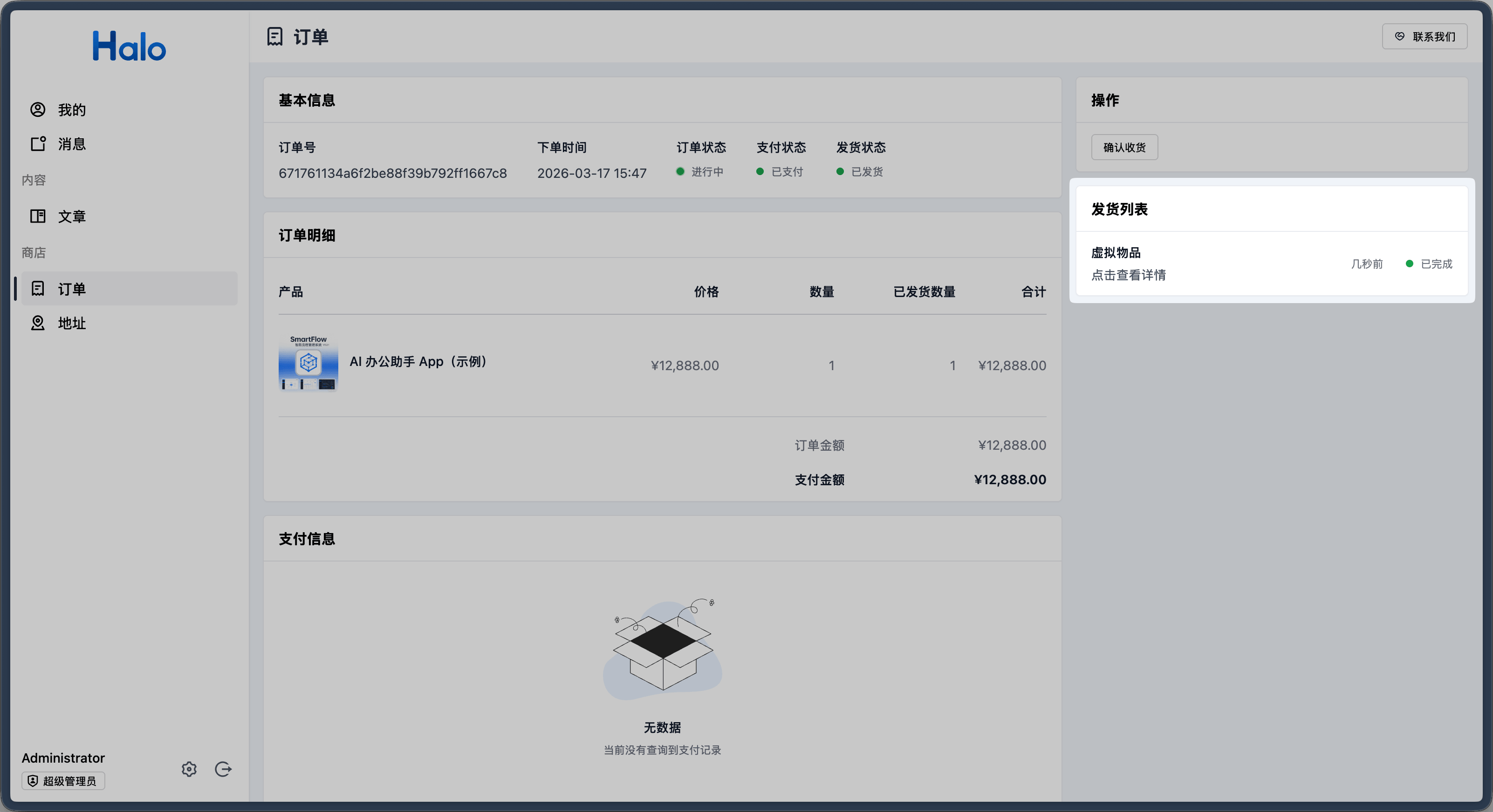 为产品配置好虚拟交付之后,当客户下单并支付时,系统会自动为订单进行发货流程,可以在控制台的订单详情中看到发货状态。
